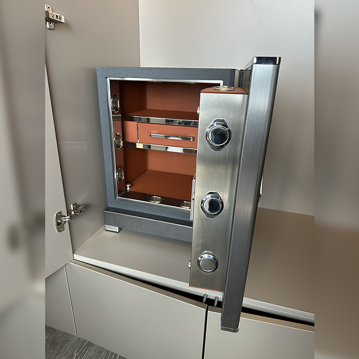 Ngay khi mở két, người dùng sẽ được chiêm ngưỡng hệ thống nội thất bọc da PU chắc chắn. Phần da này được hoàn thiện vô cùng tỉ mỉ và chắc chắn, đi cùng với viền kim loại sáng bóng, cao cấp.