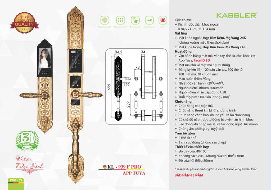 + Mặt khóa ngoài: Hợp kim kẽm,Mạ Vàng 24K(chống xuống màu theo thời gian)
