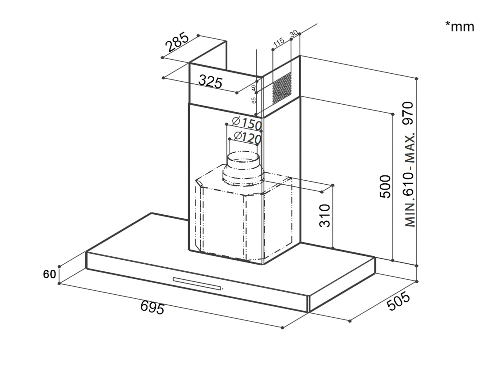 Gây ấn tượng với thiết kế chữ T mới độc đáo. Máy có thiết kế mặt kính đen độc đáo phù hợp với nhiều không gian bếp. Kính cường lực chịu nhiệt rất tốt nên không nứt nẻ hay vỡ khi tiết xúc với nhiệt độ cao. Vỏ ngoài bằng thép cao cấp không gỉ, chống ăn mòn và dễ vệ sinh. Kích thước máy là 700mm phù hợp nhiều căn bếp Việt.